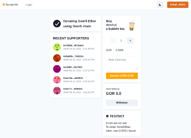 Donate Me 1 min preact web3 solidity A web application for recieving cryptocurrency coin (ERC20). The idea is heavily inspired by Buy Me A coffee. Demo (donate.dewkul.me) Repository # Preact - Donate Me